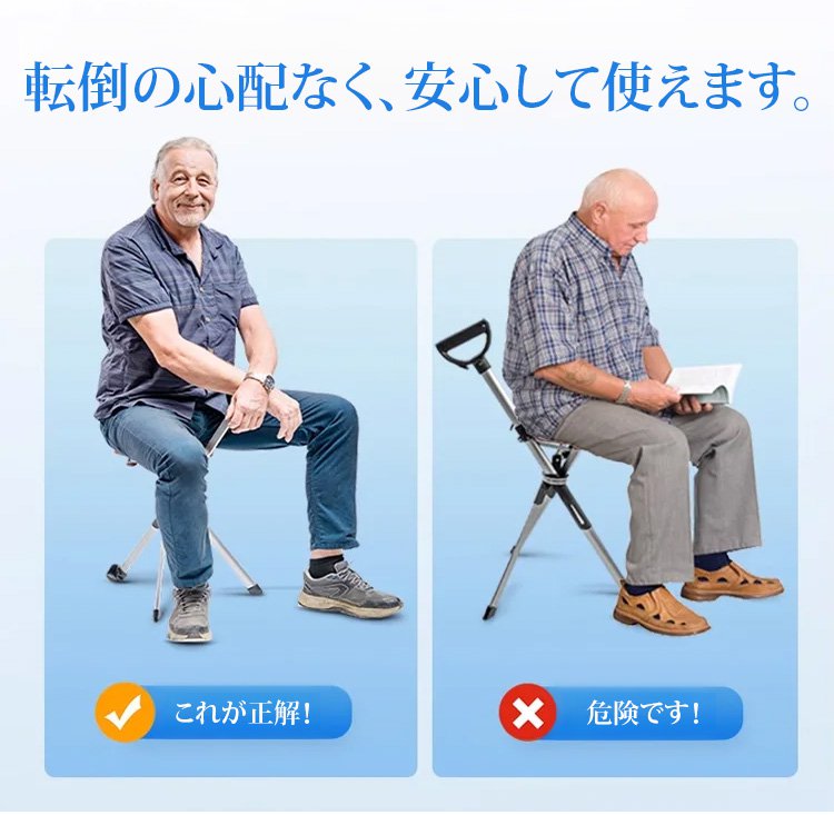 1秒で椅子に変わる杖、いつでもどこでも休憩可能!5段階調整可能、140cmから190cmまで対応!